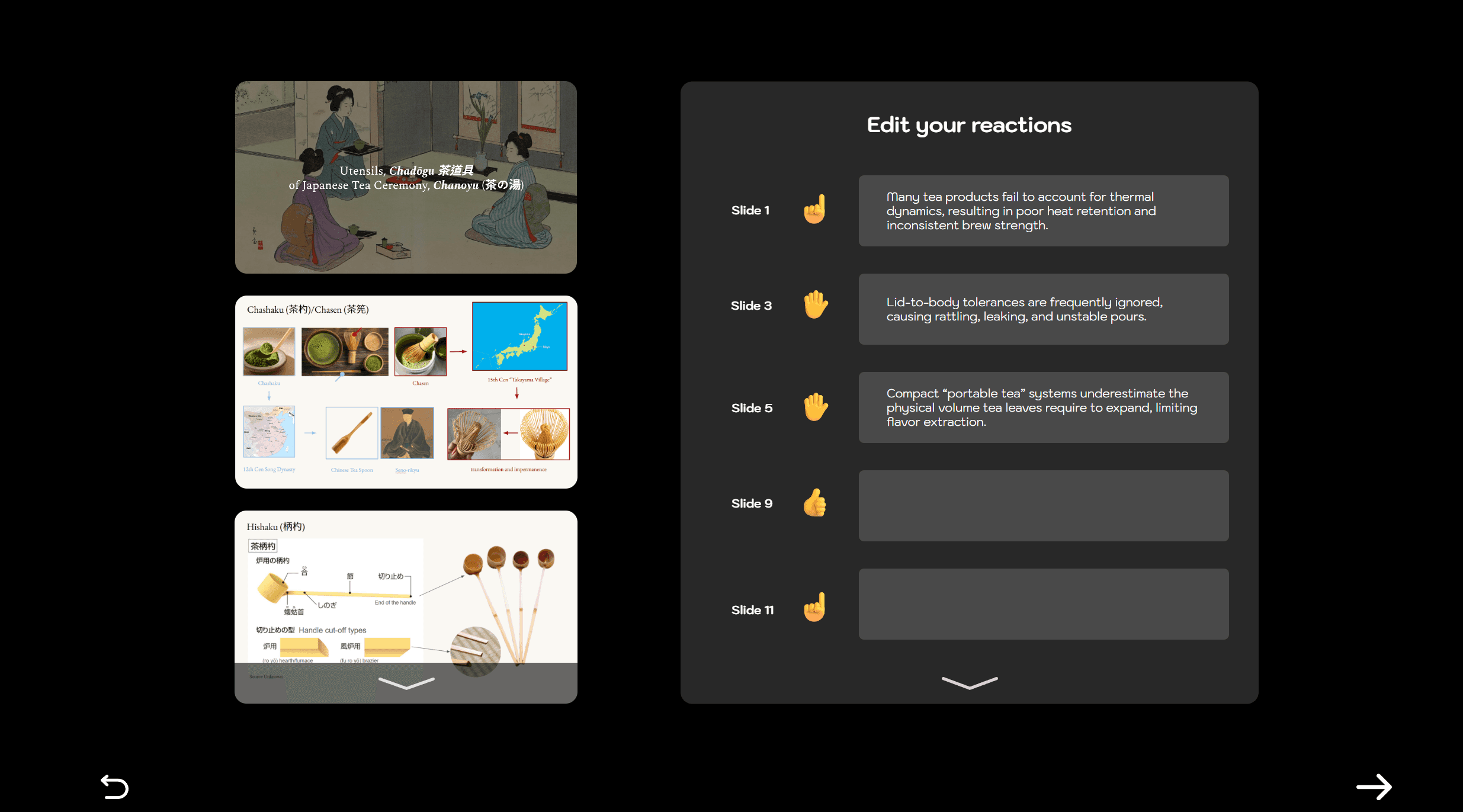 After the presentation ends, is given a short reflection window of approximately 3–5 minutes to review an interface that aggregates audience gestures and written comments