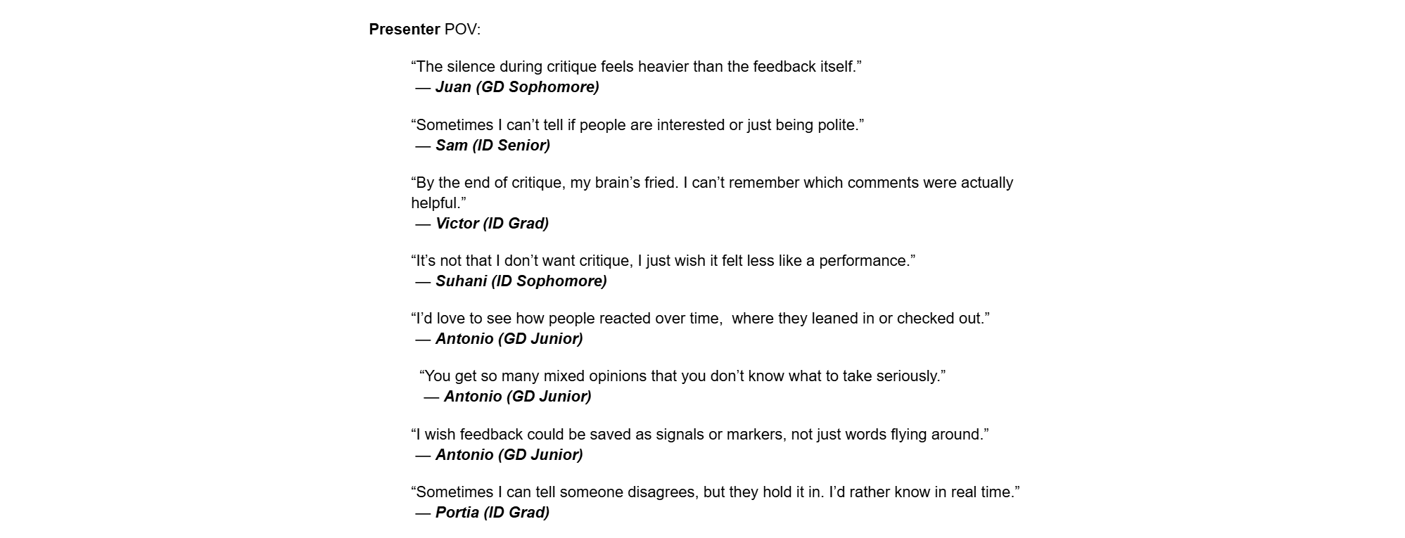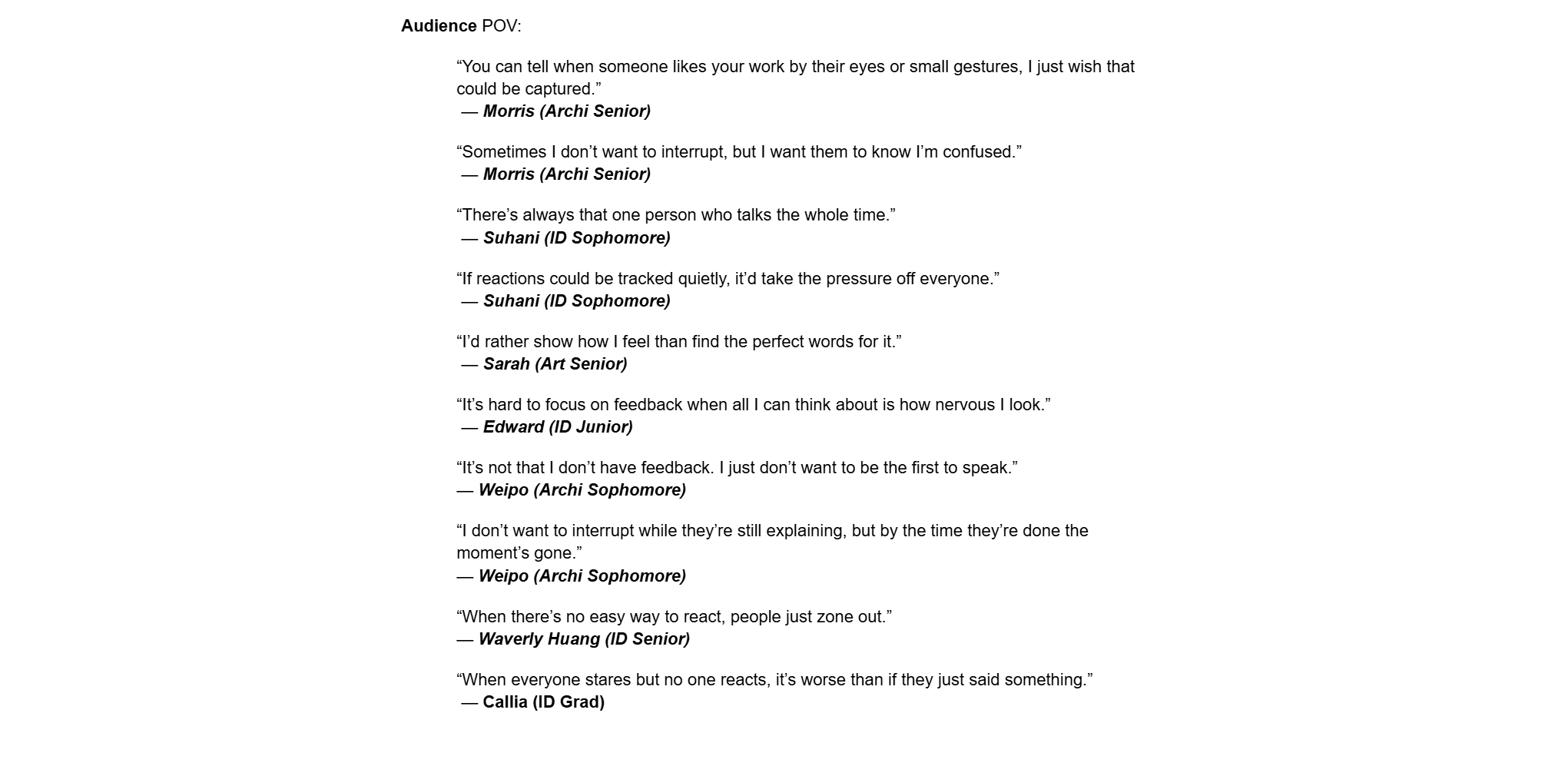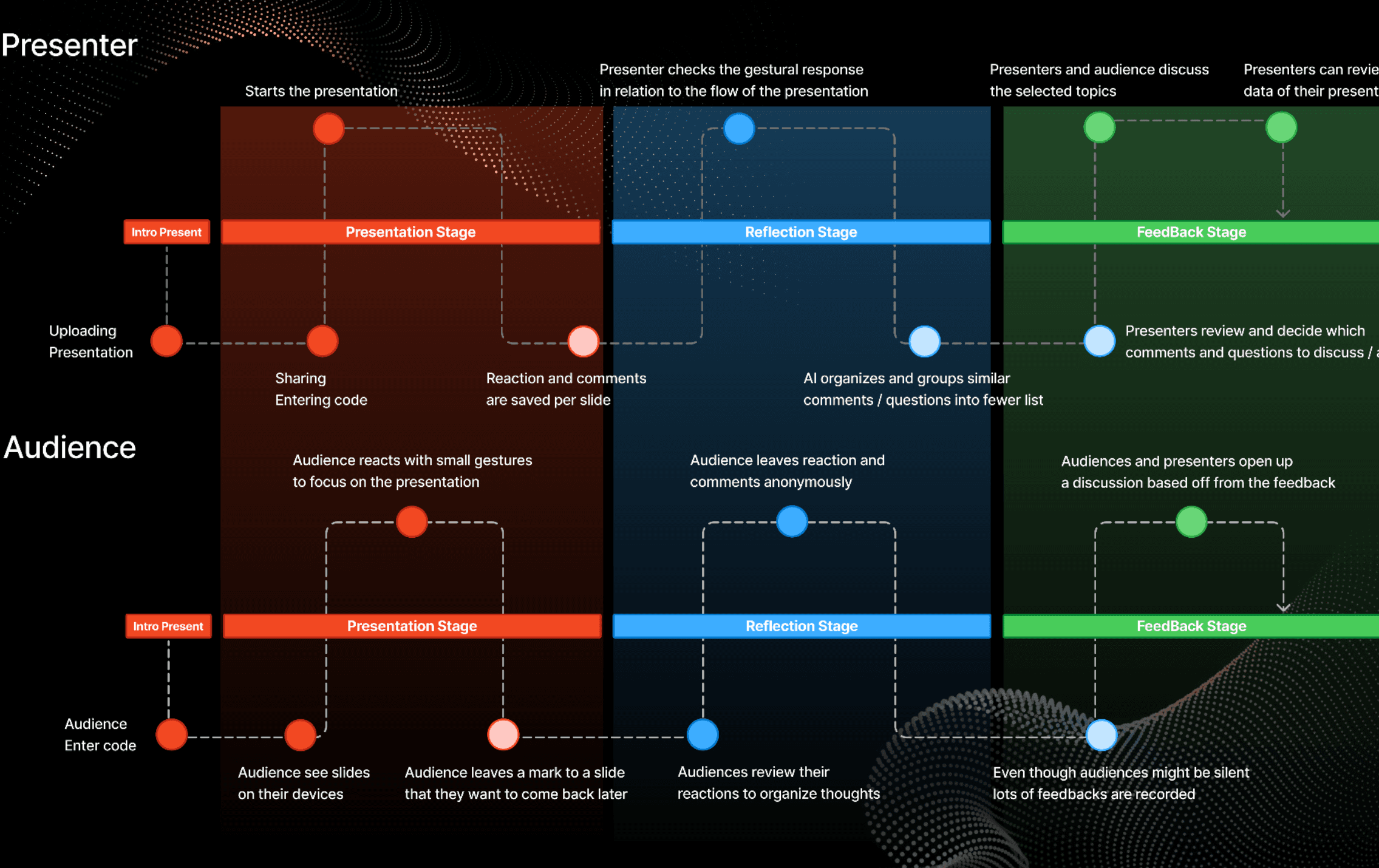 To explore possible solutions, I prototyped the system from multiple angles. Our team developed web-based tools using JavaScript and Python to test real-time feedback during live presentations, and conducted surveys to better understand audience behavior in remote settings. Based on these findings, we created interface concepts in Figma to examine how feedback could be visualized without interrupting the presentation.