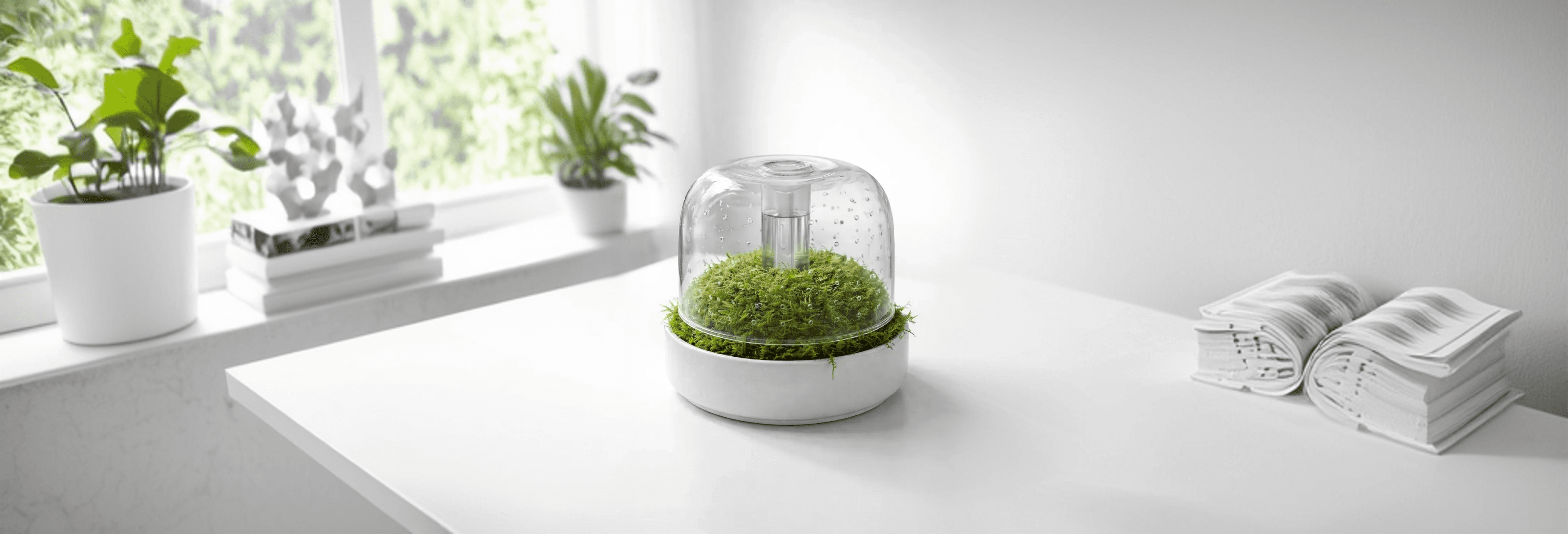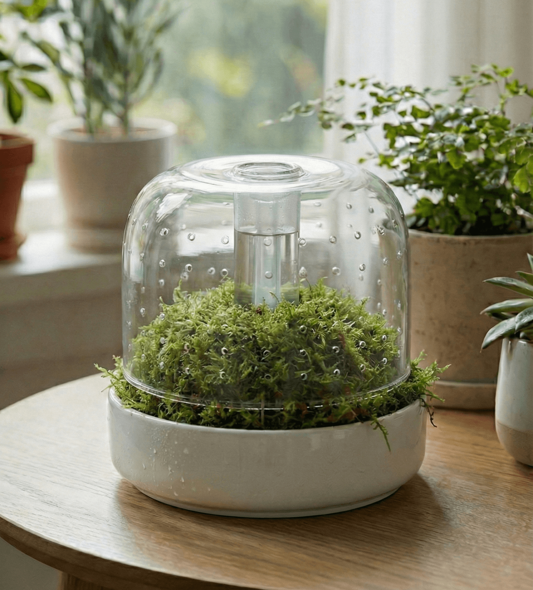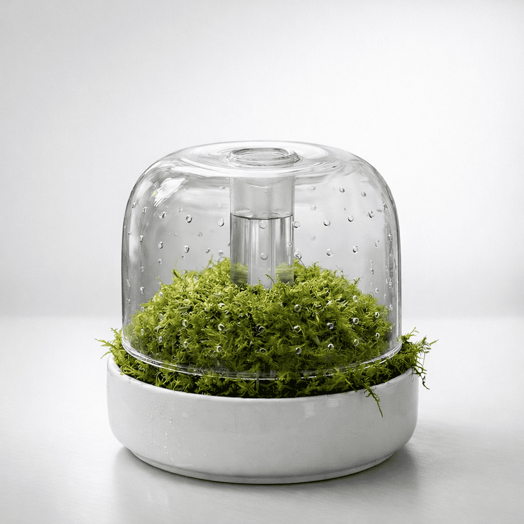 The dome-shaped form maximizes the moss’s air contact area, enabling gentle humidification and air purification through passive evaporation. The system operates entirely without electricity or mechanical components.