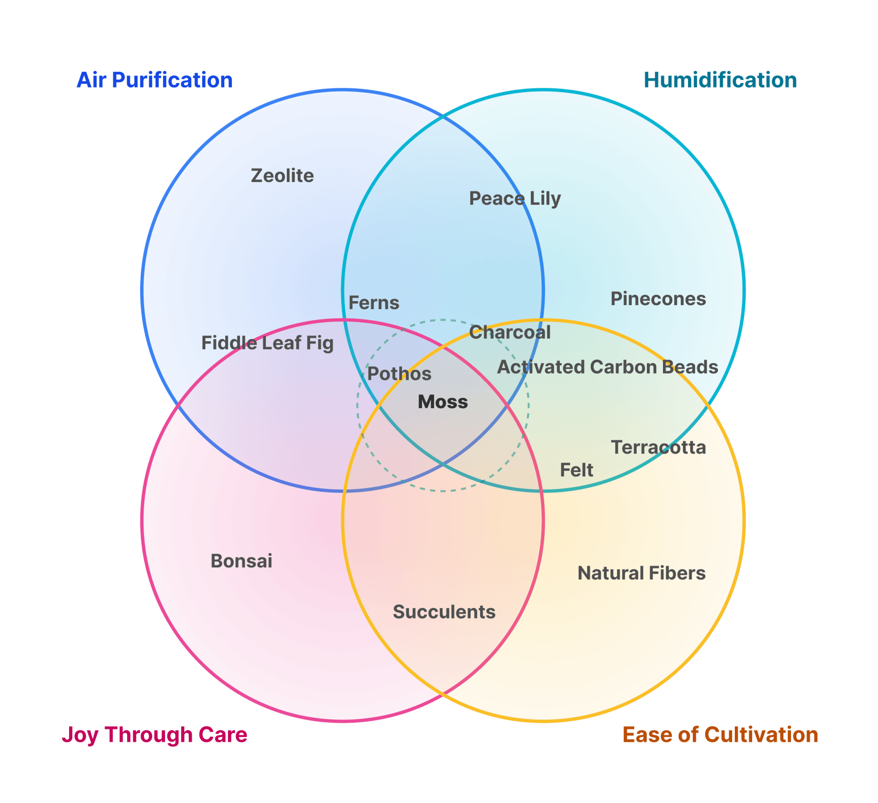 Four criteria were considered in material selection: air purification, humidification, ease of care, and emotional engagement through cultivation. While many sustainable materials satisfied some of these aspects, moss was the only material that balanced all four, making it the most suitable choice for long-term domestic use.