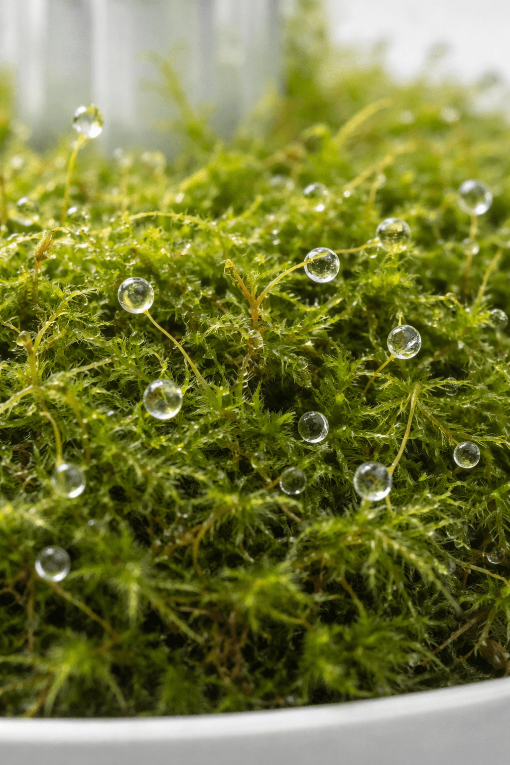Water is refilled through an opening at the top of the dome and stored in a small reservoir beneath the moss. A wool felt layer draws the water upward through capillary action, providing steady moisture without over-saturation.